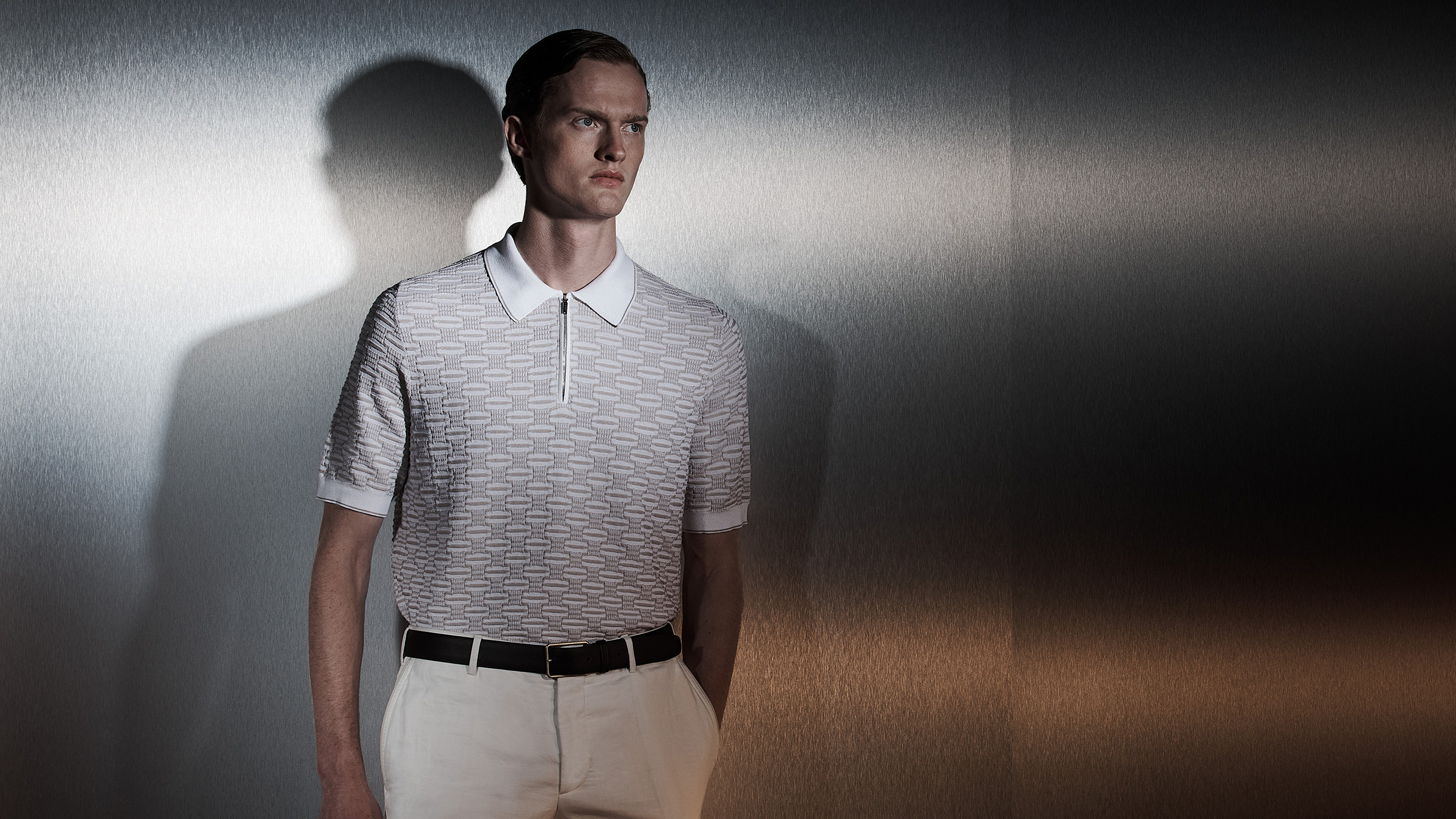 Ecru and beige zipped polo, crocodile detail, "Micro griffon" embroidery In silk, cashmere, cotton and hemp knit
