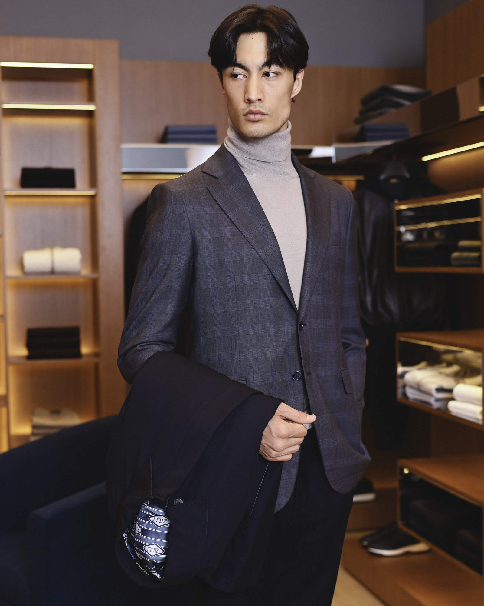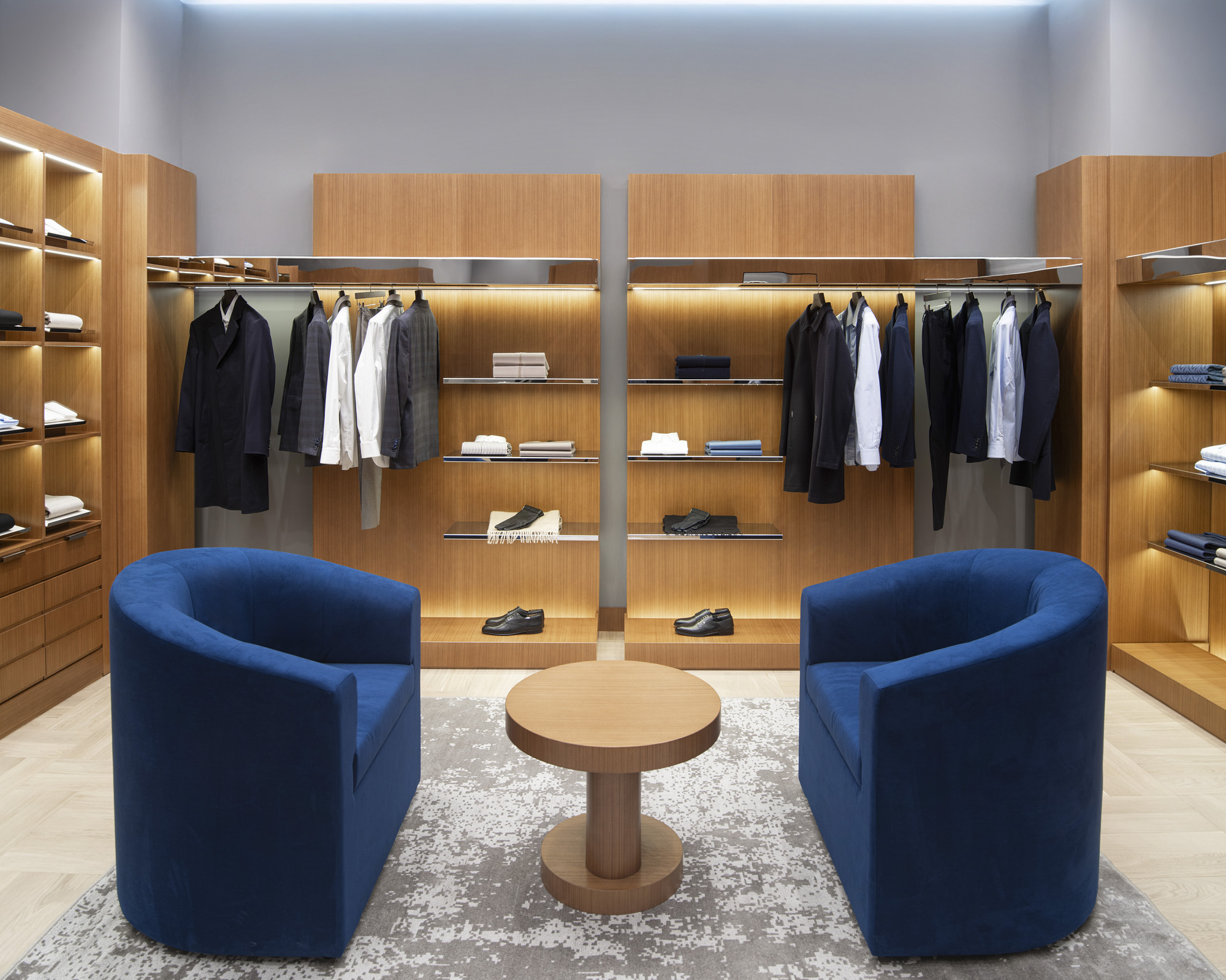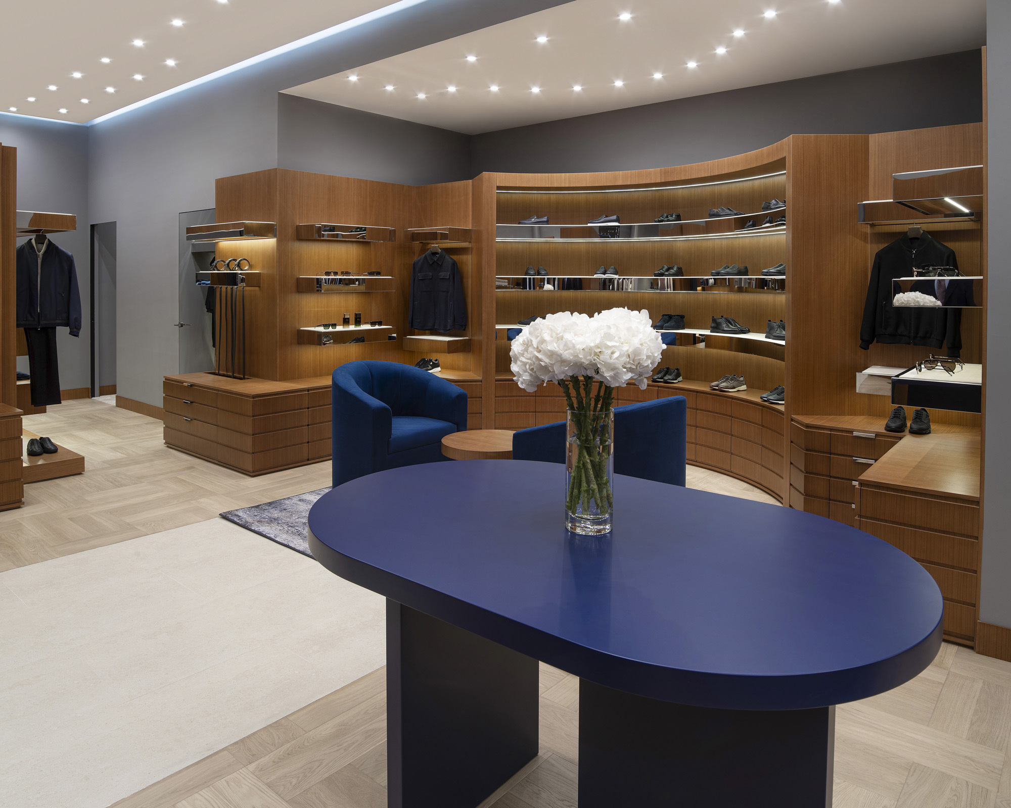 The rooms are enveloped in shadow grey tones, enhanced by subtle integrated lighting. Carefully directed spotlights draw attention to key pieces, ensuring that every garment is presented with the utmost care and precision. In a dialogue between heritage and modernity, the furniture design reinterprets French refinement through contemporary craftsmanship. Velvet seating in deep indigo blue echoes the signature hues of ZILLI’s creations, while elegant textures and lines elevate the experience of the space.